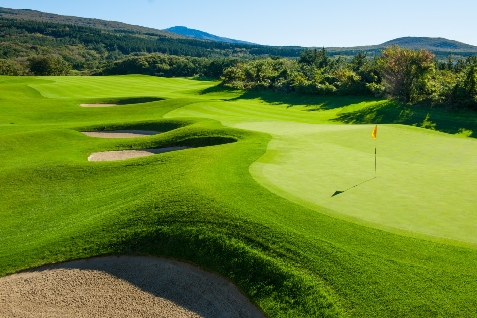 “Tanpa angin berembus sebagaimana biasanya, para pemain ini bisa memukul mid-iron,” ujar Dale. “Ada persamaan serupa, tapi dengan lebih bernuansa, yang ikut bermain di beberapa hole di Nine Bridges. Di hole 16 [hole bergaya Cape, par 4 sepanjang 427 yard], posisi bunker fairway yang membentuk elemen Cape, dan di mana fairway menjadi sempit di area pendaratan bola, dikalibrasikan secara spesifik untuk menjebak para pemain untuk melakukan pukulan yang berpotensi bahaya, tapi juga bisa memberi ganjaran dari atas tee. Tapi semua itu juga didasarkan pada embusan angin yang bertiup, jadi saya bilang, berembuslah angin!”